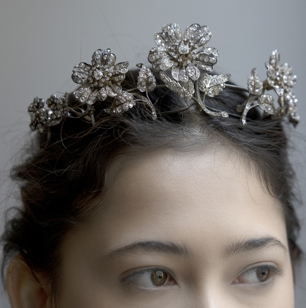 Silver, gold, and diamond tiara decorated with removable trembling flowers.