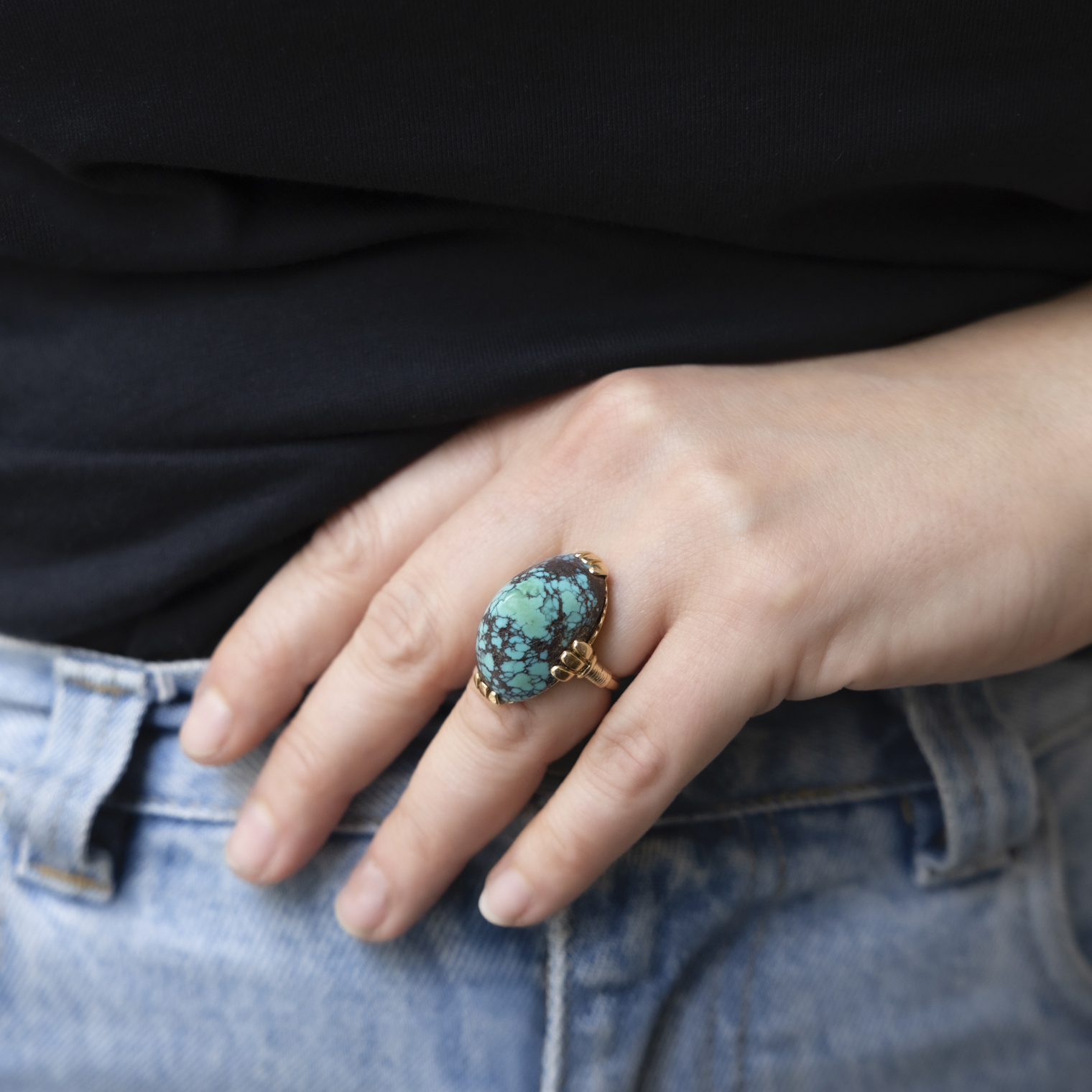 Bague Turquoise Bague en or et turquoise matrix. Année : Vers 1910 Matériaux : Or et turquoise matrix Tour de doigt : 51 Poids : 16.97 g 4 500€ 1 en stock quantité de Bague Turquoise Acheter Poser une question CommentsCe champ n’est utilisé qu’à des fins de validation et devrait rester inchangé.Poser une question Je souhaite en savoir plus Prénom*Nom*E-mail* Sélection de la créationCe champ est masqué lorsque l‘on voit le formulaire.Adresse vers la création Votre messagePolitique de confidentialité (RGPD)* J’accepte la politique de confidentialité.Le contenu du formulaire est seulement stocké sur ce site afin de pouvoir établir un échange avec vous. Sur simple demande les données peuvent être supprimées. Merci de vous rendre sur cette page dédiée pour plus de détail. Δ