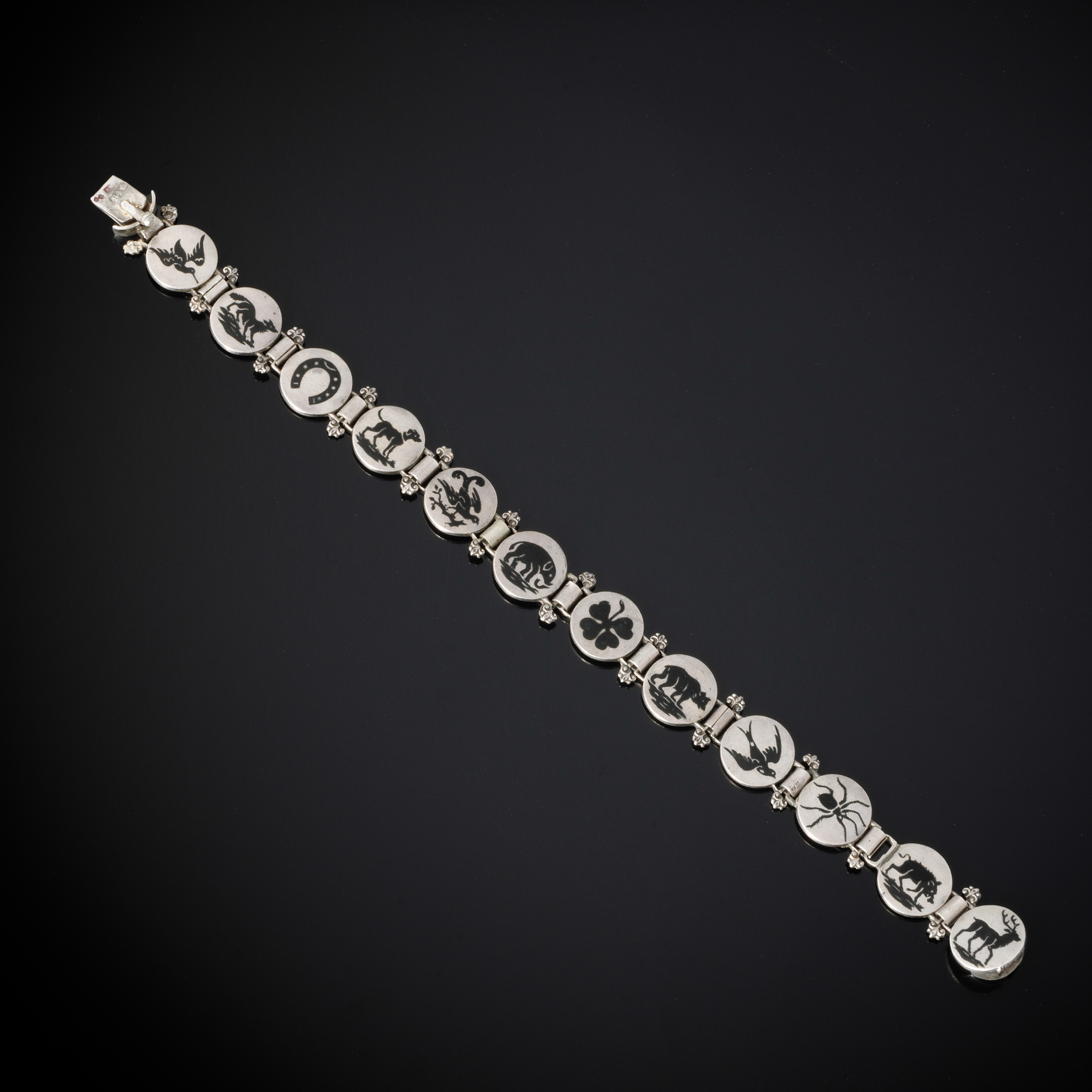 Bracelet Charm’s Bracelet Charm’s en argent et émail. Année : 1900 Matériaux : Argent émail Poids : 23.07 g Dimensions (cm) : 19 x x (L x l x H) 2 000€ 1 en stock quantité de Bracelet Charm's Acheter Poser une question NameCe champ n’est utilisé qu’à des fins de validation et devrait rester inchangé.Poser une question Je souhaite en savoir plus Prénom*Nom*E-mail* Sélection de la créationCe champ est masqué lorsque l‘on voit le formulaire.Adresse vers la création Votre messagePolitique de confidentialité (RGPD)* J’accepte la politique de confidentialité.Le contenu du formulaire est seulement stocké sur ce site afin de pouvoir établir un échange avec vous. Sur simple demande les données peuvent être supprimées. Merci de vous rendre sur cette page dédiée pour plus de détail. Δ