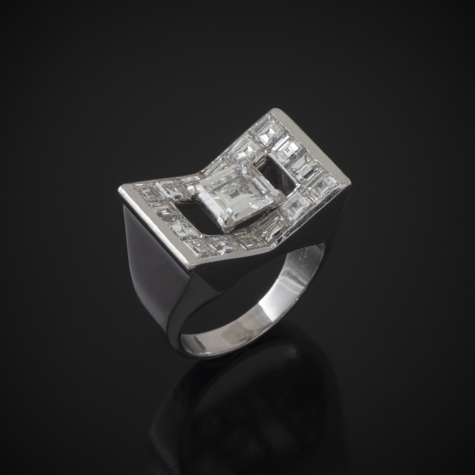 Bague géometrique en platine et diamants (Diamant central 1,08 carats G VS1). Signée et numérotée.