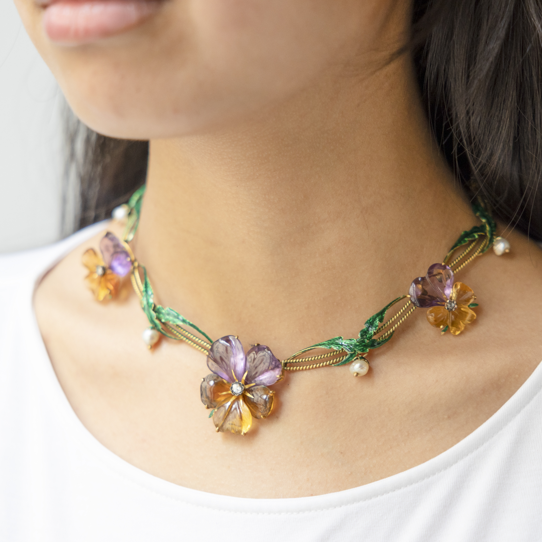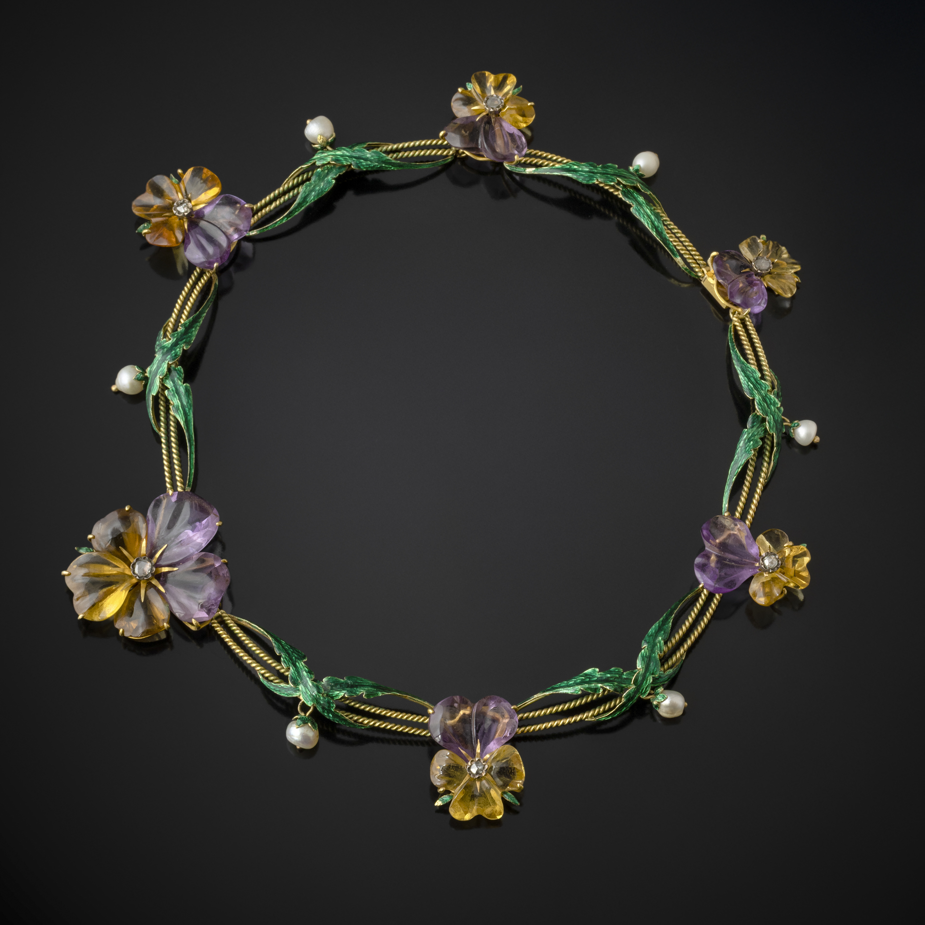 Collier aux sept pensées en or, émail, citrines, améthystes, perles et diamants.