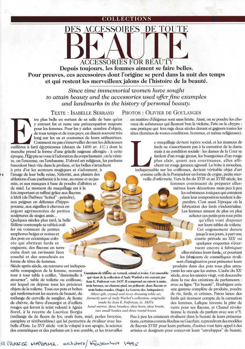 - Matériaux : argent, vermeil, ivoire, cristal.