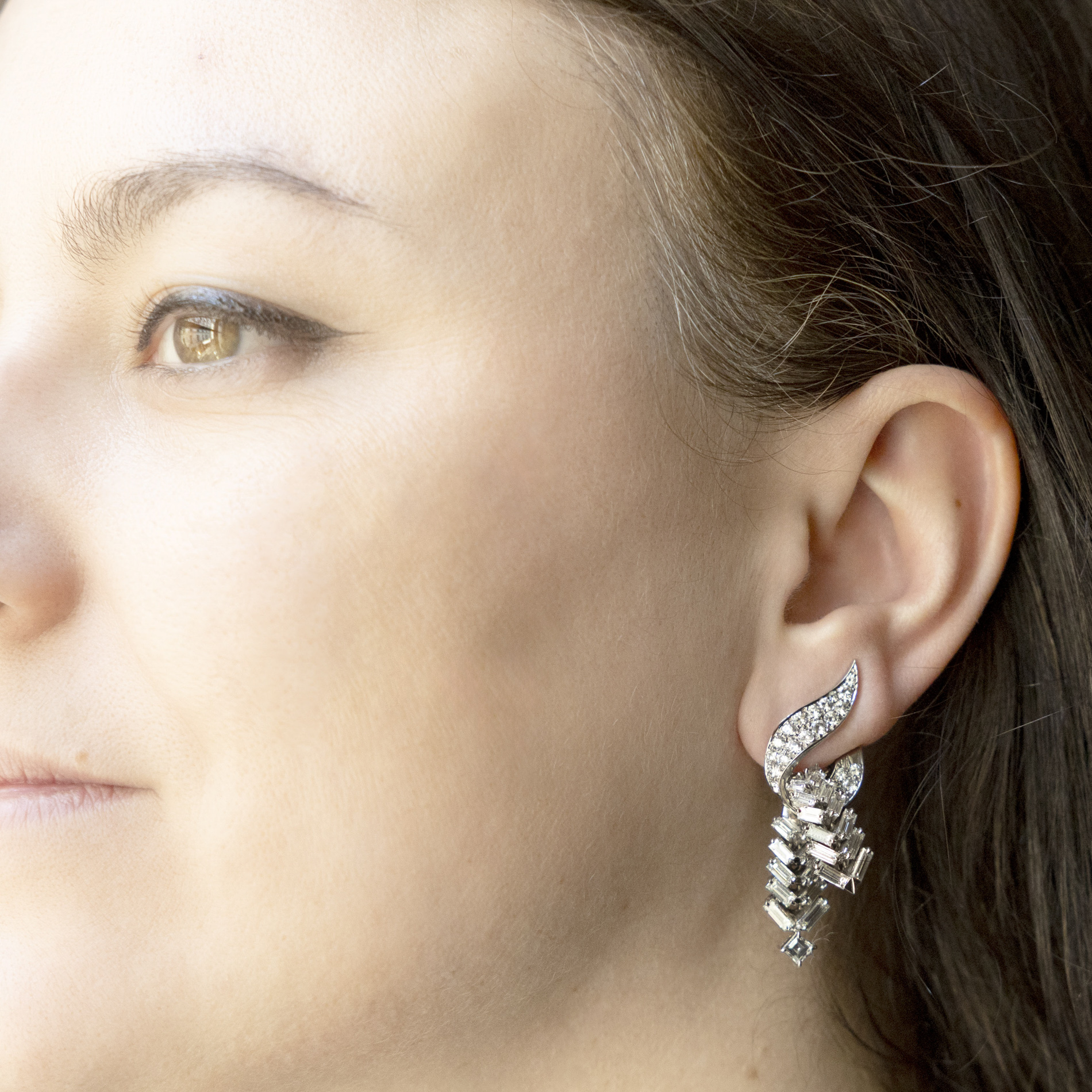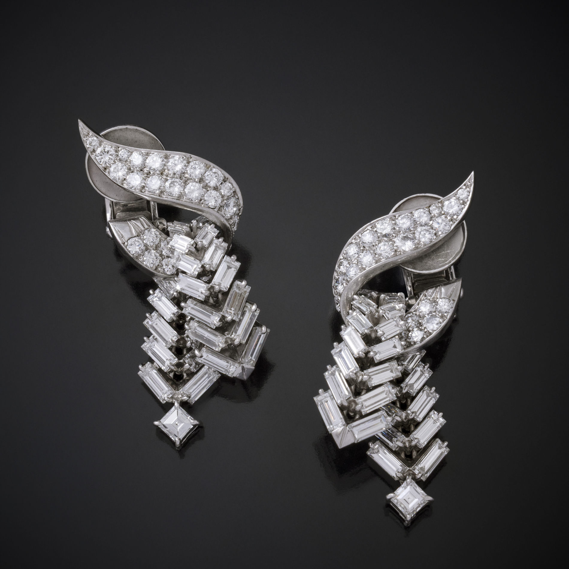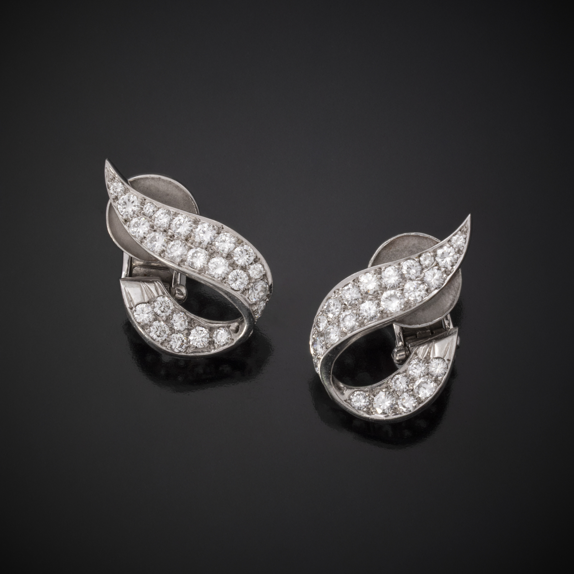 Paire de clips d’oreilles transformables en platine, or gris et diamants.