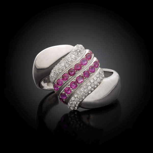 Bracelet modèle « Torsade » en or gris et platine à décor de 4 godrons, au centre une double ligne de rubis pesant au total 13.47 carats, épaulée de diamants de taille ancienne.